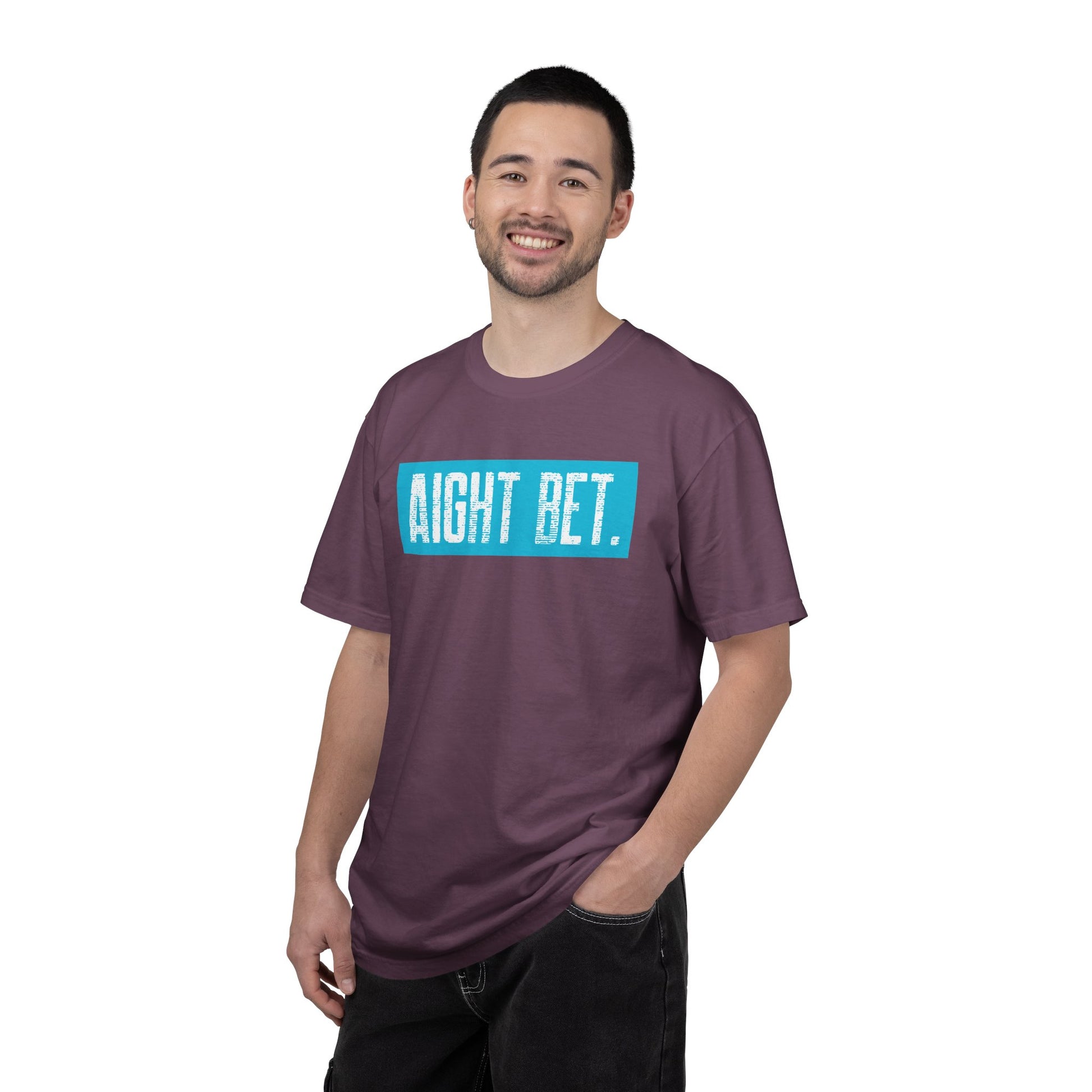 A relaxed, garment-dyed cotton tee that feels lived-in from the first wear. The heavyweight, 100% ring-spun cotton holds its shape while the post-construction dye gives the fabric a soft, vintage texture and slightly broken-in color. The front chest features a bold, weathered blue block print reading “AIGHT BET.” that reads casual and confident—an easy statement for hangouts, street days, or laid-back weekends. Sewn with double-needle stitching and a tubular knit (no side seams), this tee stays sturdy wash after wash and drapes cleanly across the shoulders. Comfortable, simple, and quietly expressive—this tee slips into daily life and becomes one of the shirts you reach for without thinking.