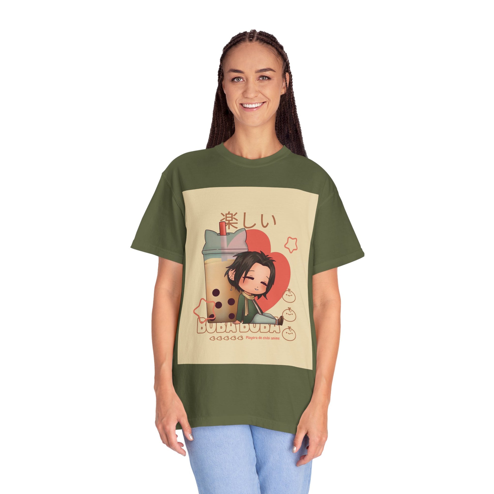 Soft, lived-in cotton with a playful, kawaii print — this garment-dyed tee feels like a favorite from the first wear. The front art pairs a sleepy chibi character with a giant bubble tea and warm pastel shapes, giving the shirt a cozy, nostalgic vibe. Lightweight but substantial, the relaxed cut drapes easily over jeans or layered under an open shacket. Wear it on slow afternoons at a café, while sketching in your journal, or when you want to carry a little bit of sweet comfort with you. The muted, garment-dyed tones soften after washing and keep the design feeling gentle and personal rather than loud or flashy.