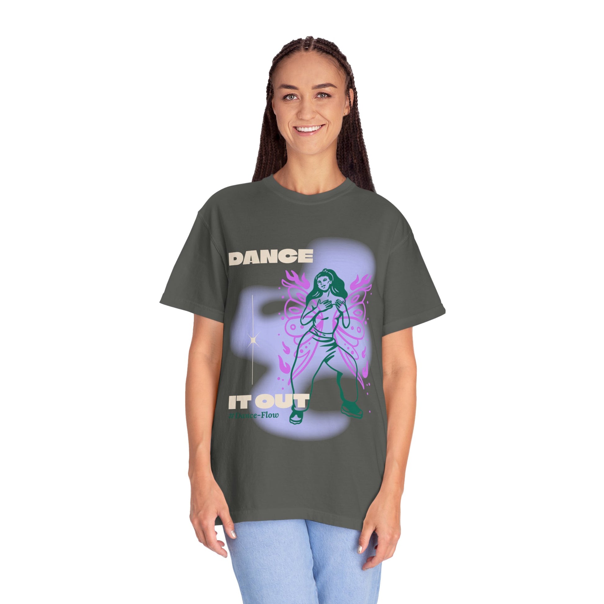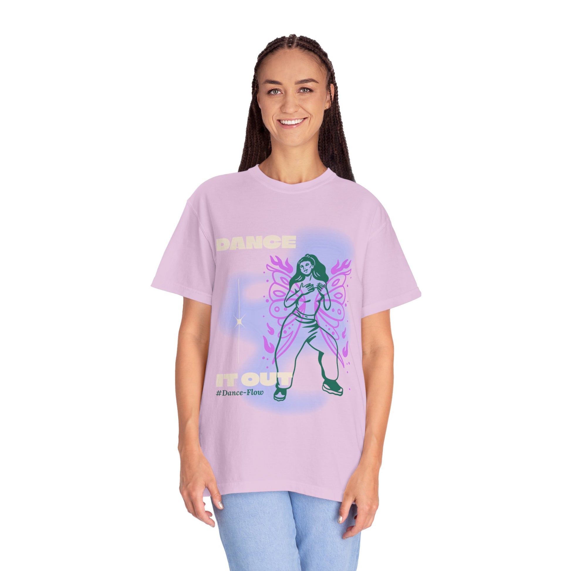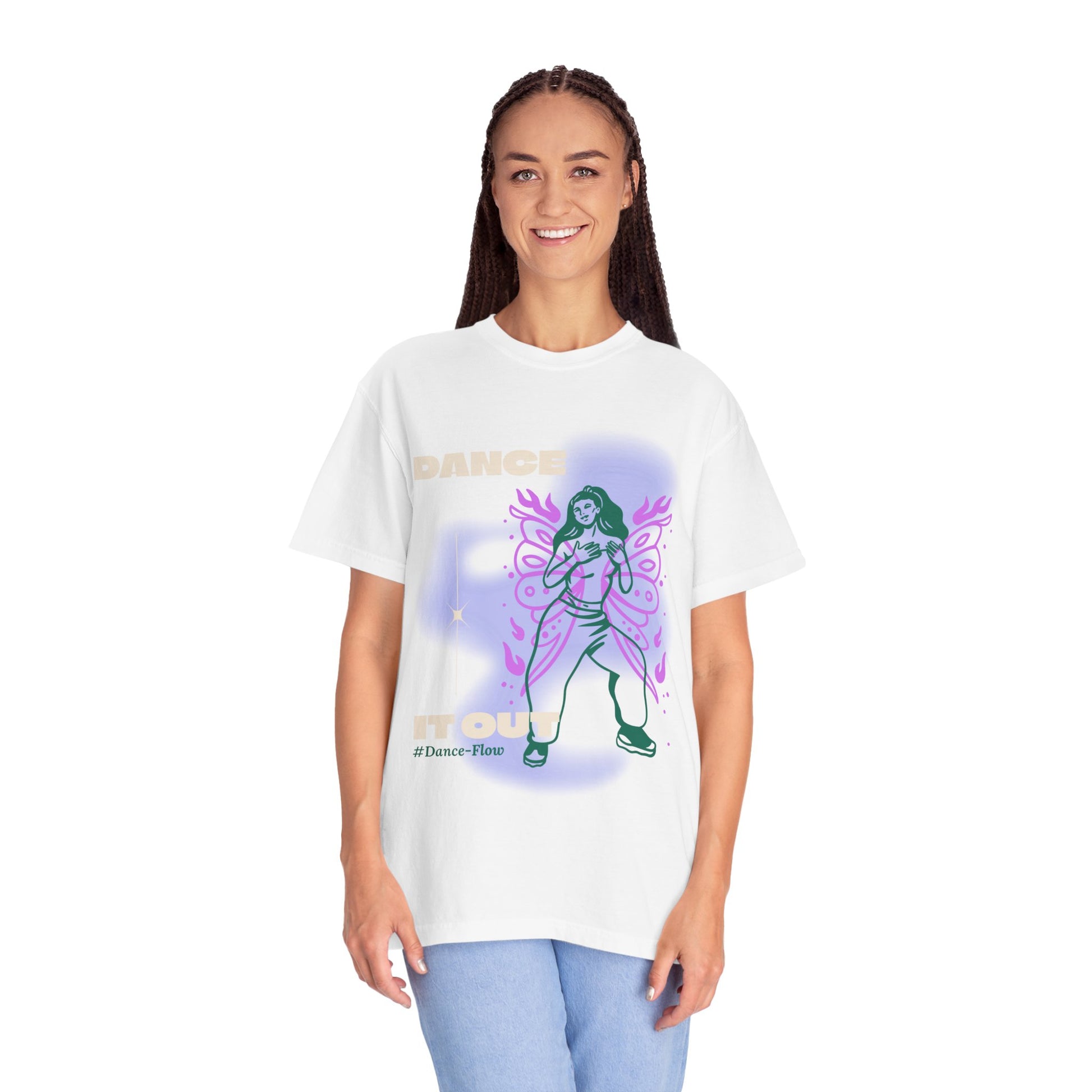 This garment-dyed tee blends soft, lived-in comfort with playful, artsy energy. A relaxed silhouette carries a bold graphic of a confident dancer surrounded by iridescent, wing-like shapes and soft lavender haze—an image that reads like movement captured mid-breath. The washed color and slightly broken-in texture invite the wearer to sling it on for long rehearsals, late-night hangouts, or casual gallery nights. It feels like the comfortable companion that quietly celebrates creative restlessness: breathable cotton, gentle drape, and a roomy cut that moves with you rather than against you. Wear it with faded denim, layered under an oversized jacket, or alone when you want your outfit to say you came to groove and stay awhile.