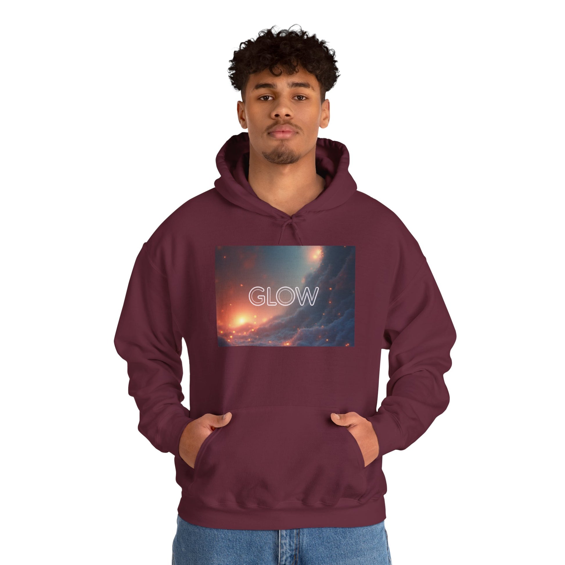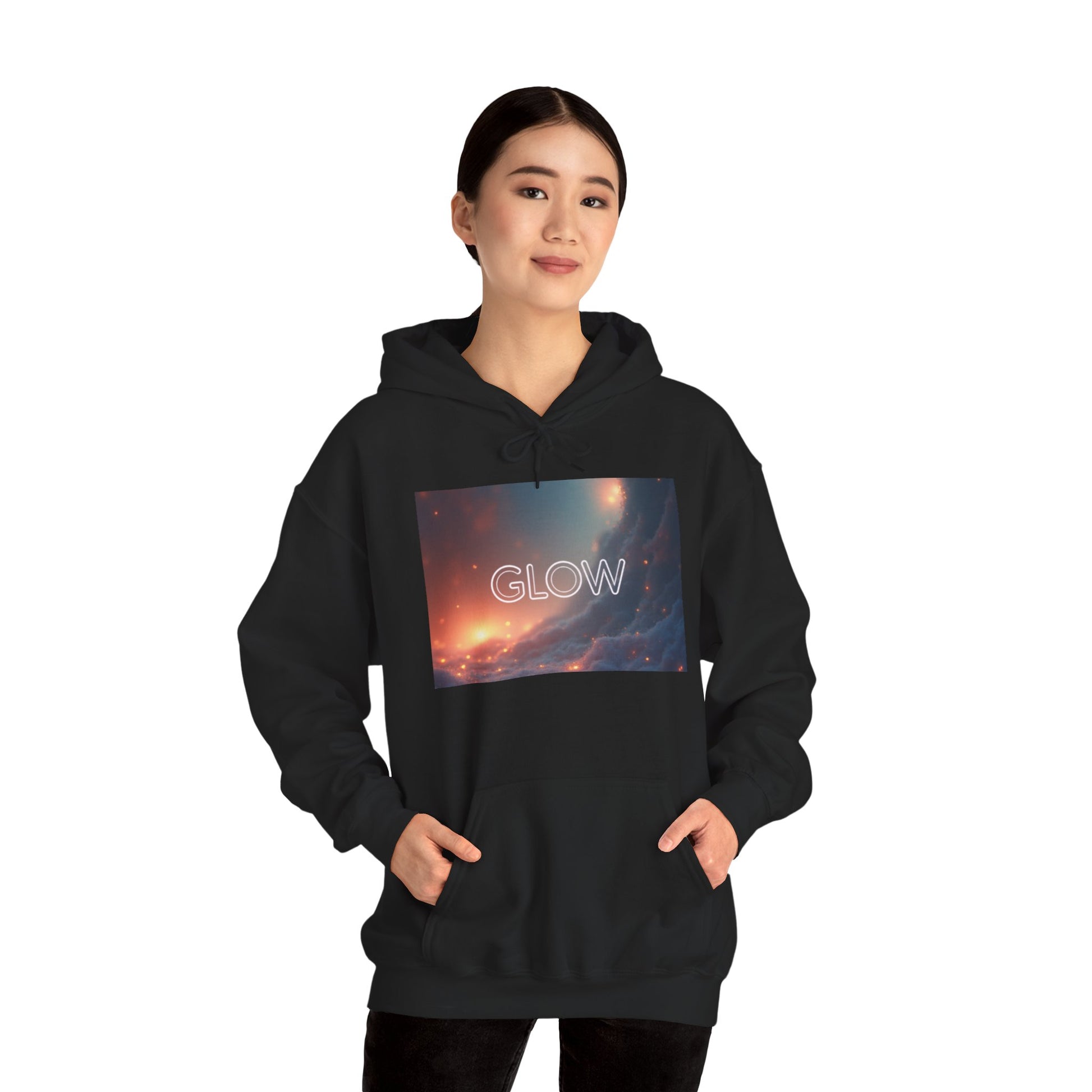 Soft, warm, and quietly luminous — this hoodie carries a little universe on its chest. The muted galaxy print fades from deep indigo to ember-orange, with a delicate neon-style "GLOW" that feels like a private reminder to keep shining. It’s the kind of layer you pull on for late-night walks, study sessions that stretch into dawn, or mornings when you want calm energy without shouting for attention. The roomy kangaroo pocket and double-lined hood make it easy to tuck hands, notes, or a steaming cup of coffee. Breathable yet substantial, it holds its shape and color wash after wash, becoming a familiar, comforting piece in a thoughtful wardrobe.