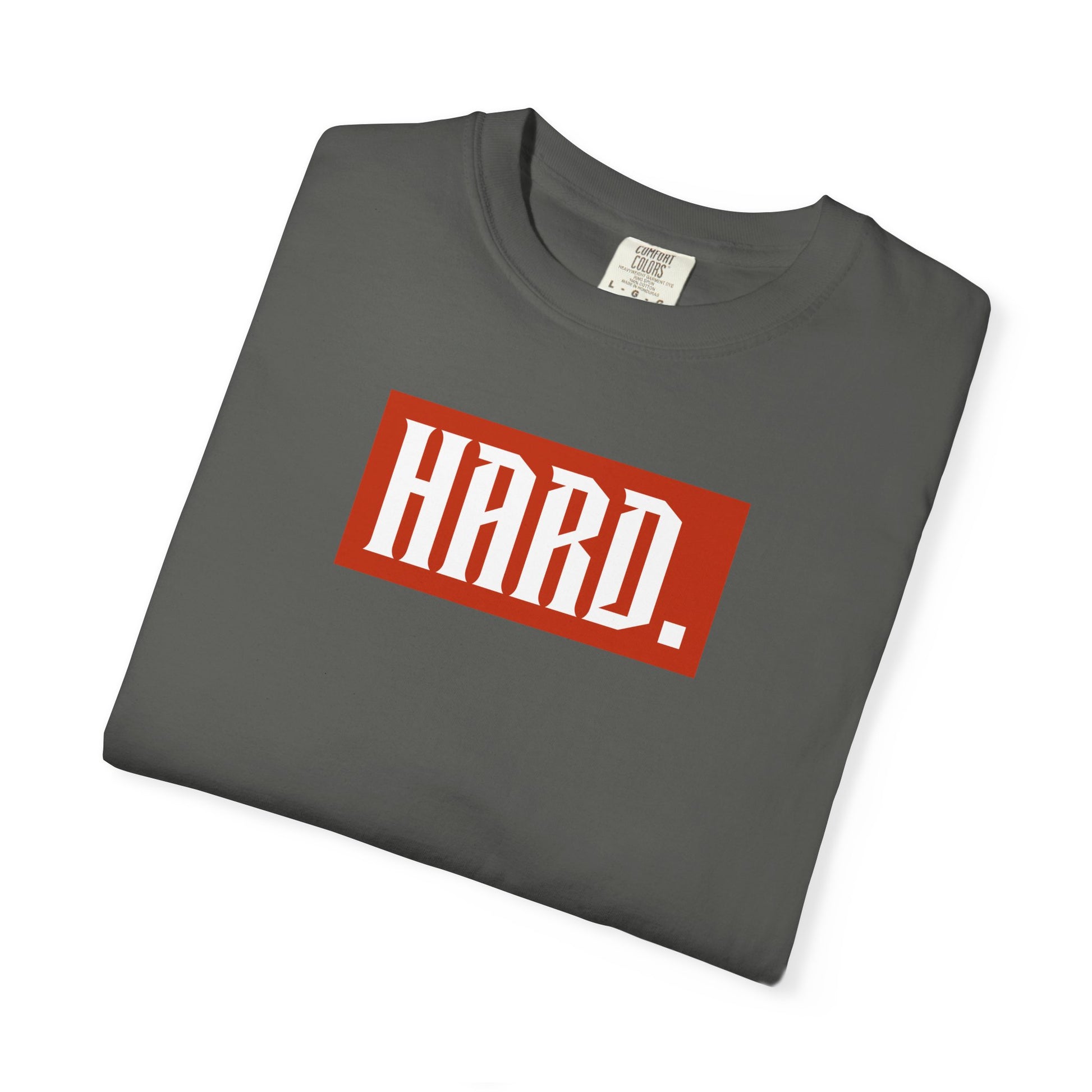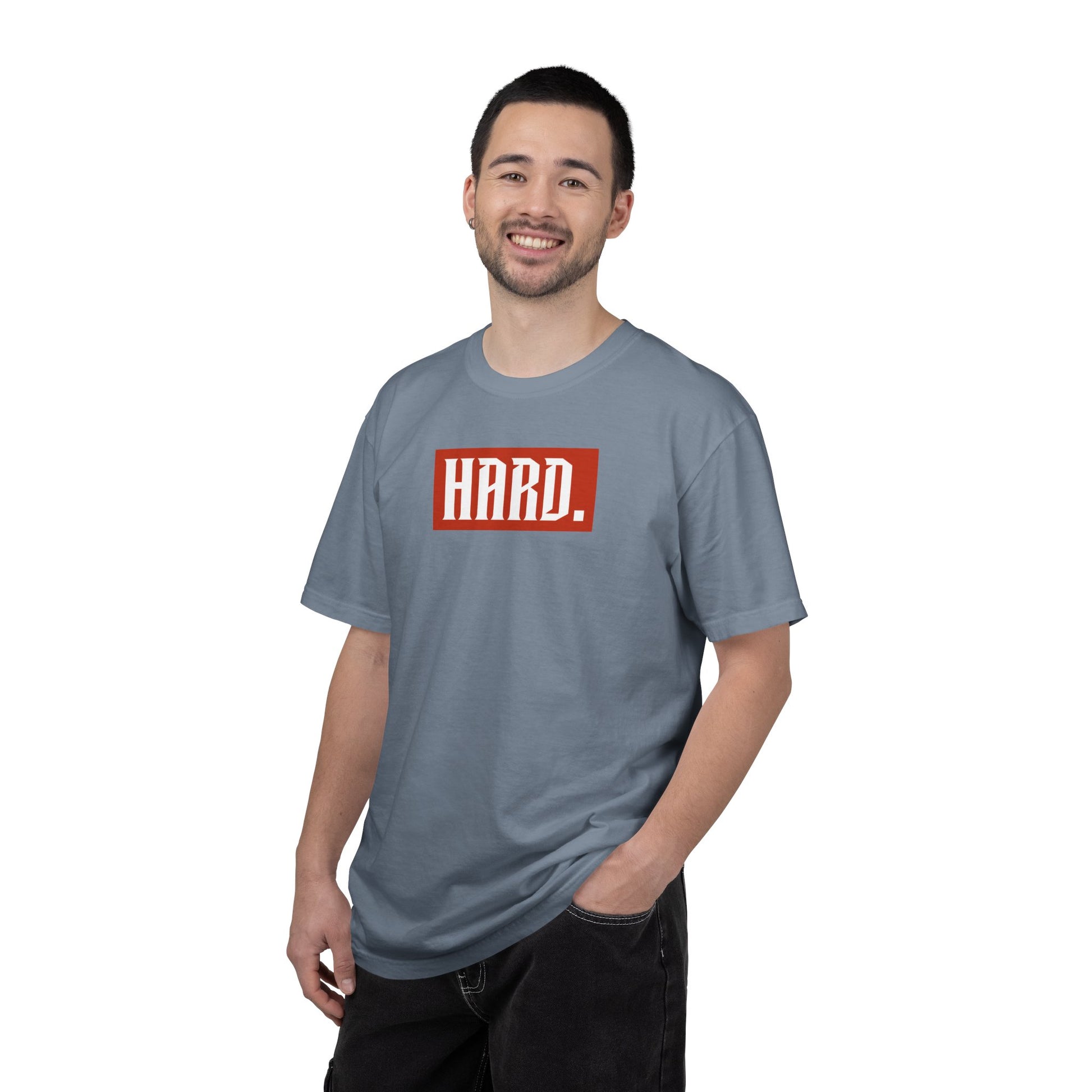 A laid-back heavyweight tee that speaks with quiet confidence. The garment-dyed, 100% ring-spun cotton feels lived-in from day one — soft, substantial, and built to last. A bold, boxed “HARD.” graphic across the chest adds an uncompromising, minimalist statement that sits perfectly within streetwear and workwear wardrobes. The relaxed fit and tubular knit offer tidy lines and comfortable movement, whether you’re layering under a jacket, stopping by the skatepark, or grabbing coffee with friends. Thoughtful construction — double-needle stitching, pre-shrunk fabric, and a sewn-in label — keeps the look simple and the wear consistent wash after wash.