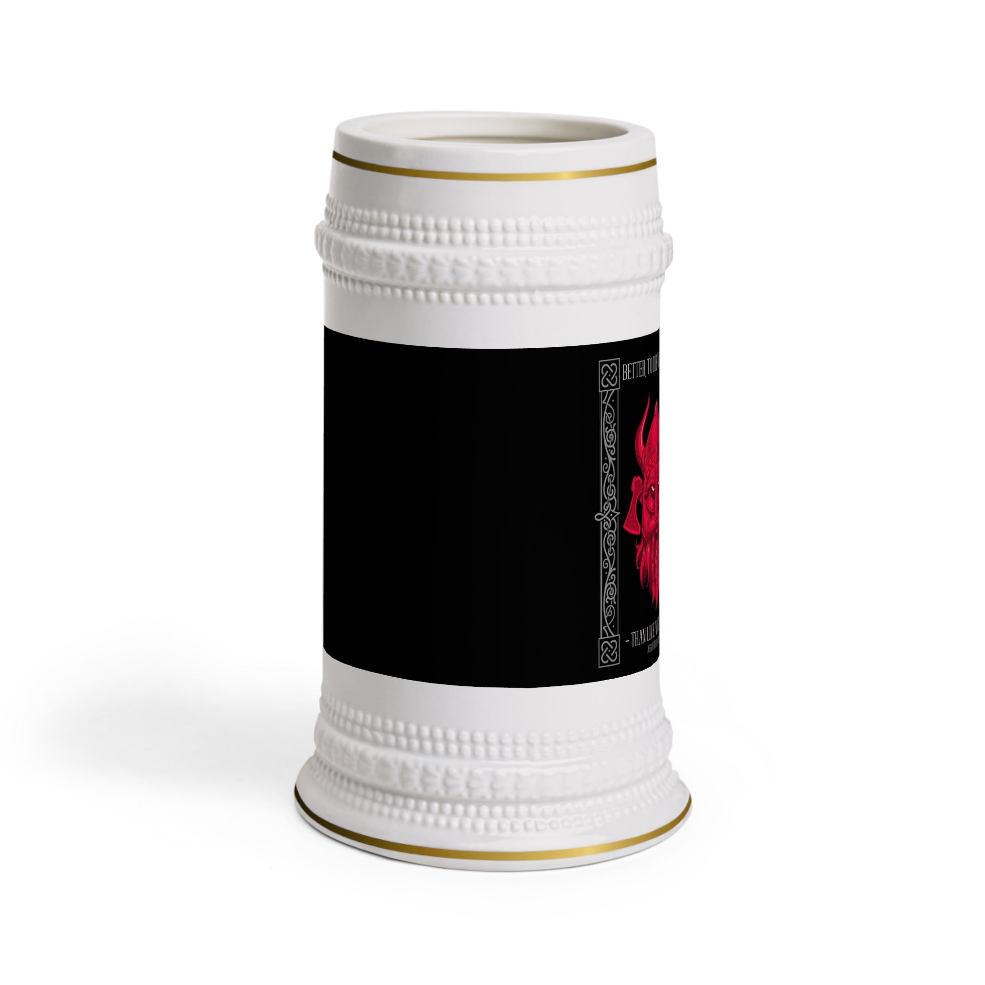 This 22oz ceramic stein brings old-world heft and modern finish to your favorite brews. The tall, sculpted body and large handle feel steady in hand, while gold-colored trim on the rim and base catches the light for an elevated look. A deep black print band highlights artwork with rich contrast thanks to ORCA coating — colors stay bright and details stay sharp through everyday use. Sturdy, dishwasher-safe ceramic makes this stein a reliable go-to for long sessions with friends or quiet evenings at home. Note: not suitable for microwave use.