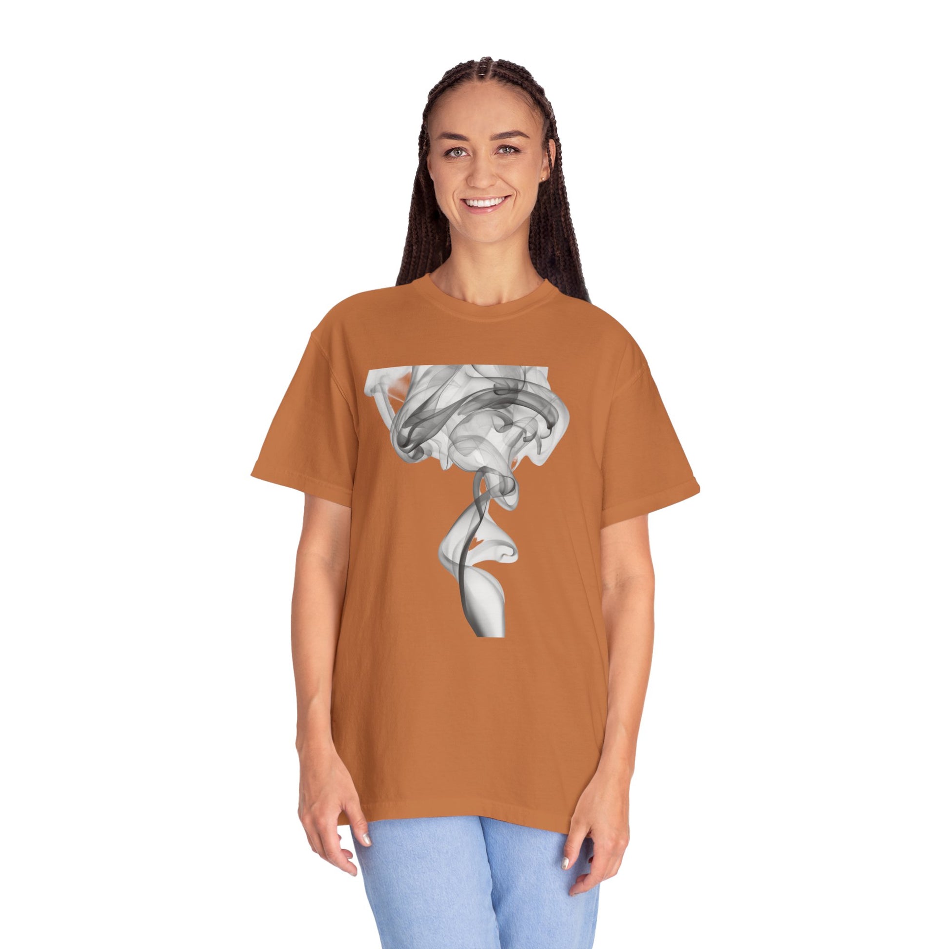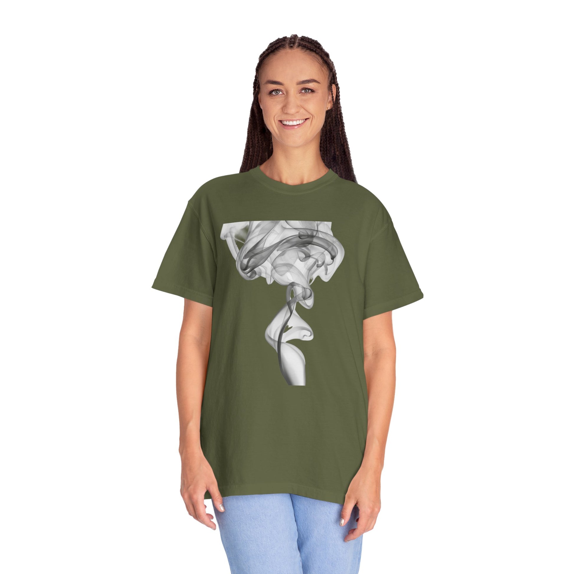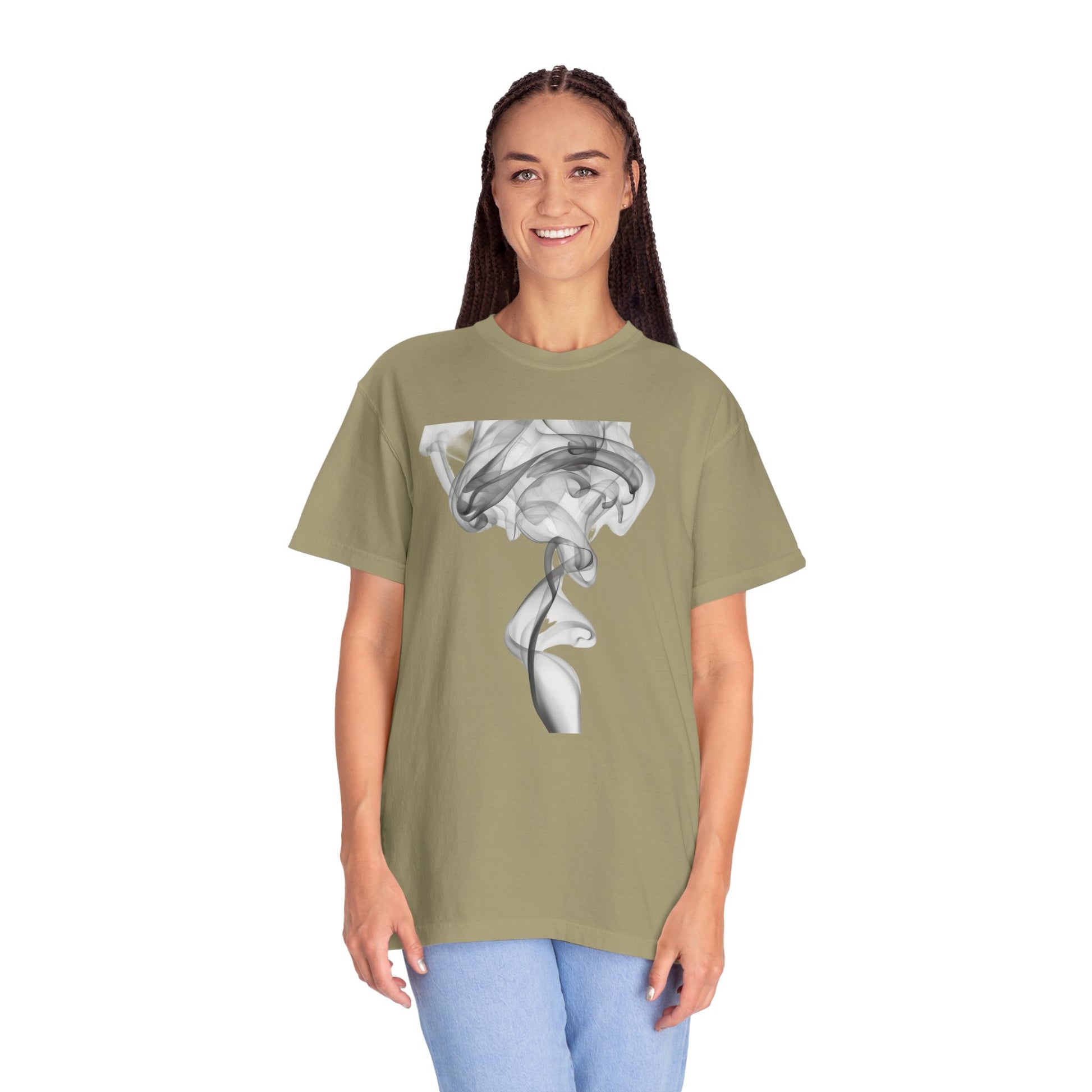 A soft, garment-dyed tee that reads like a quiet moment captured on fabric. The grayscale smoke design drifts down the chest, subtle and meditative—like breath caught between thought and movement. Lightweight but substantial, the relaxed fit and pre-shrunk 100% ring-spun cotton feel lived-in from the first wear. It layers easily under a jacket or stands alone with jeans when you want a low-key, artful look. Made with durable double-needle stitching and a tubular knit for clean lines, this shirt ages gracefully and holds its shape through many washes.