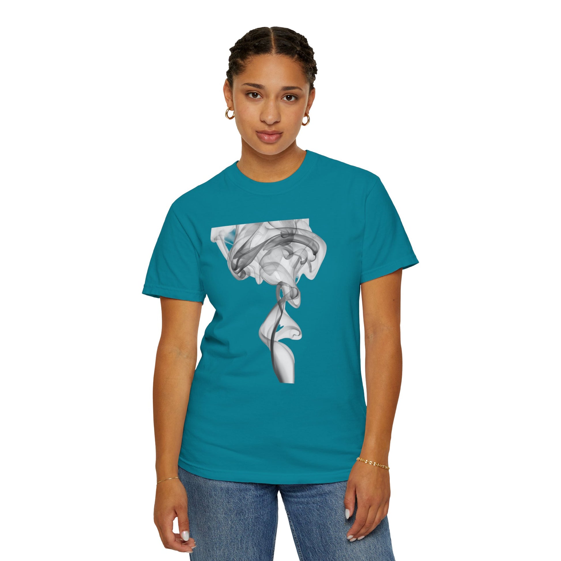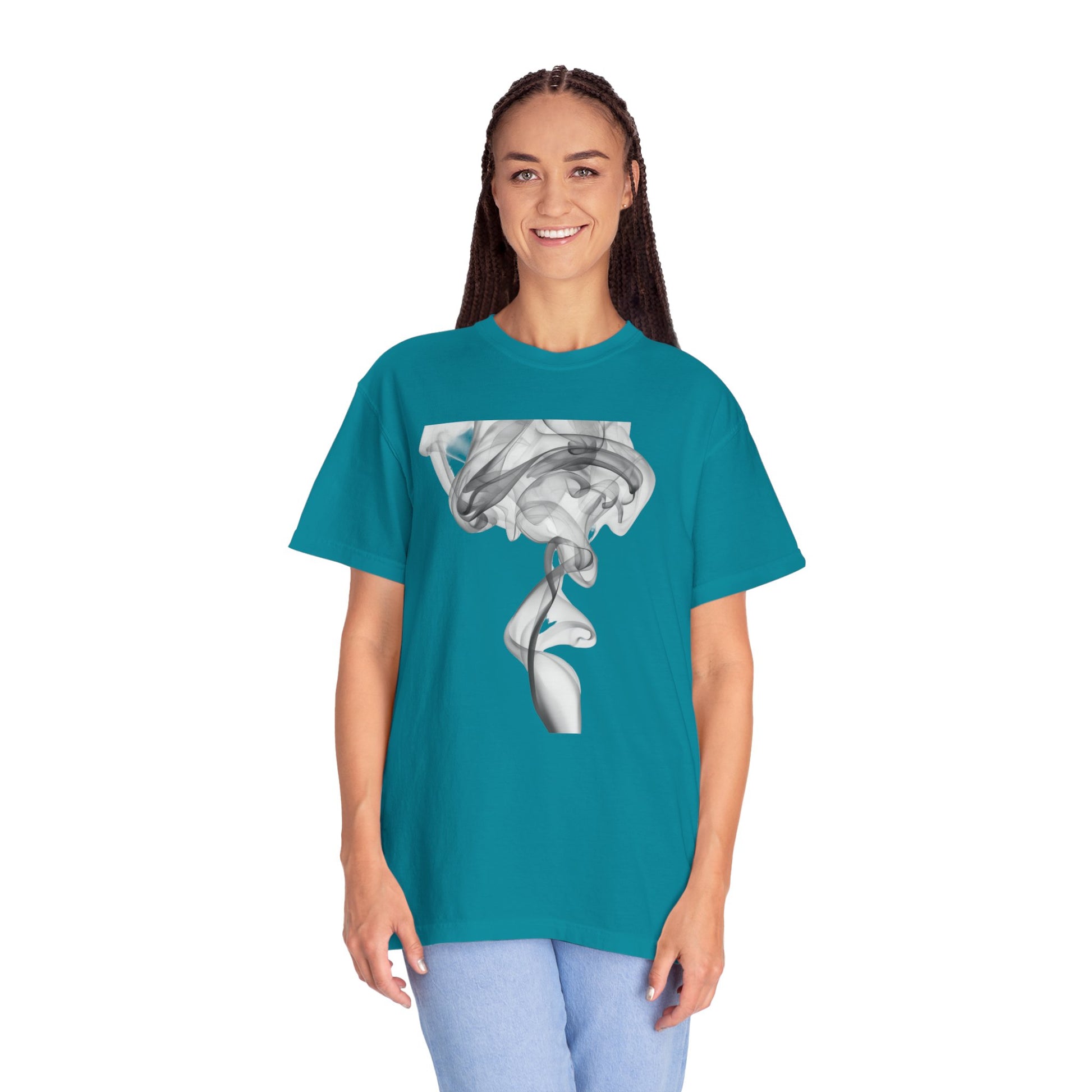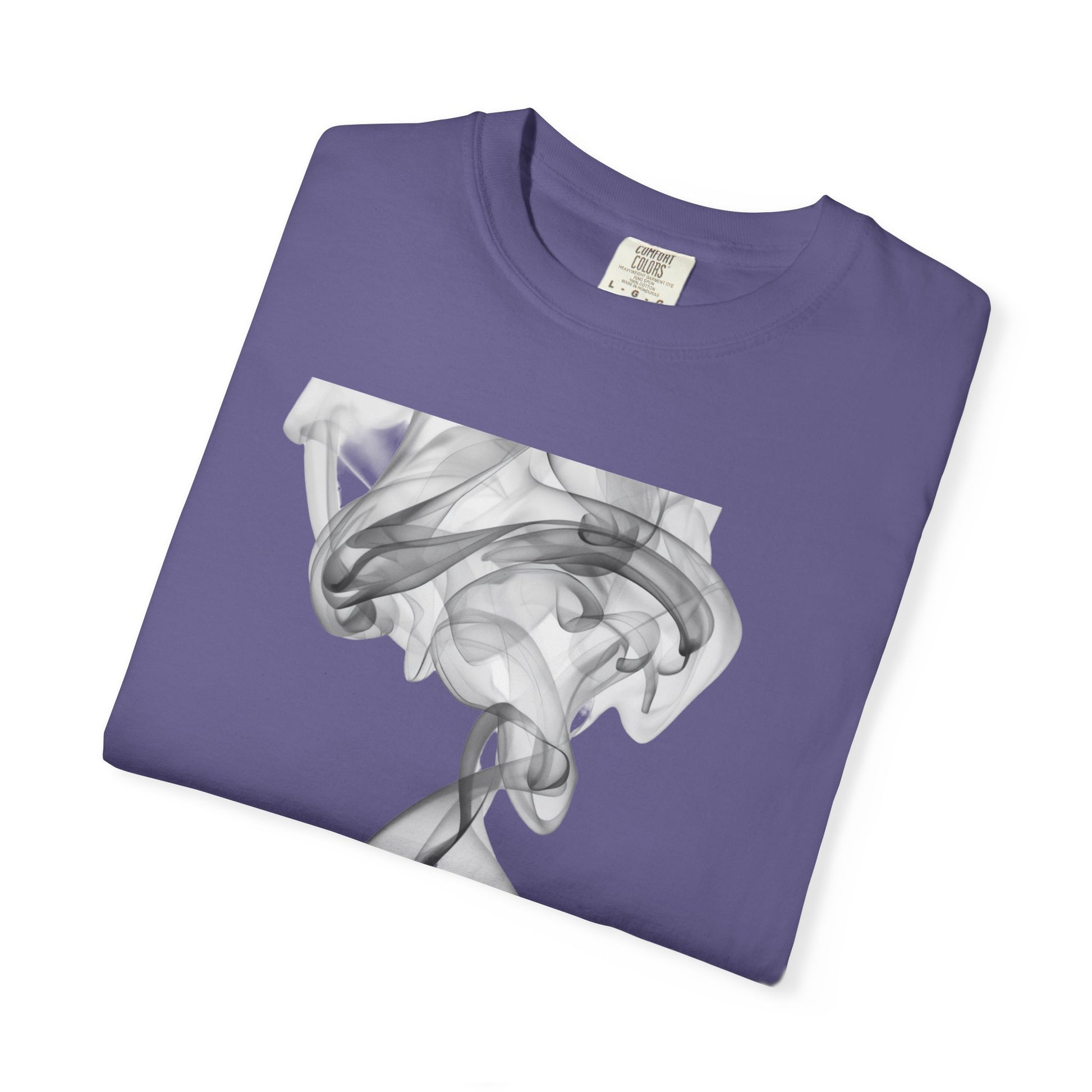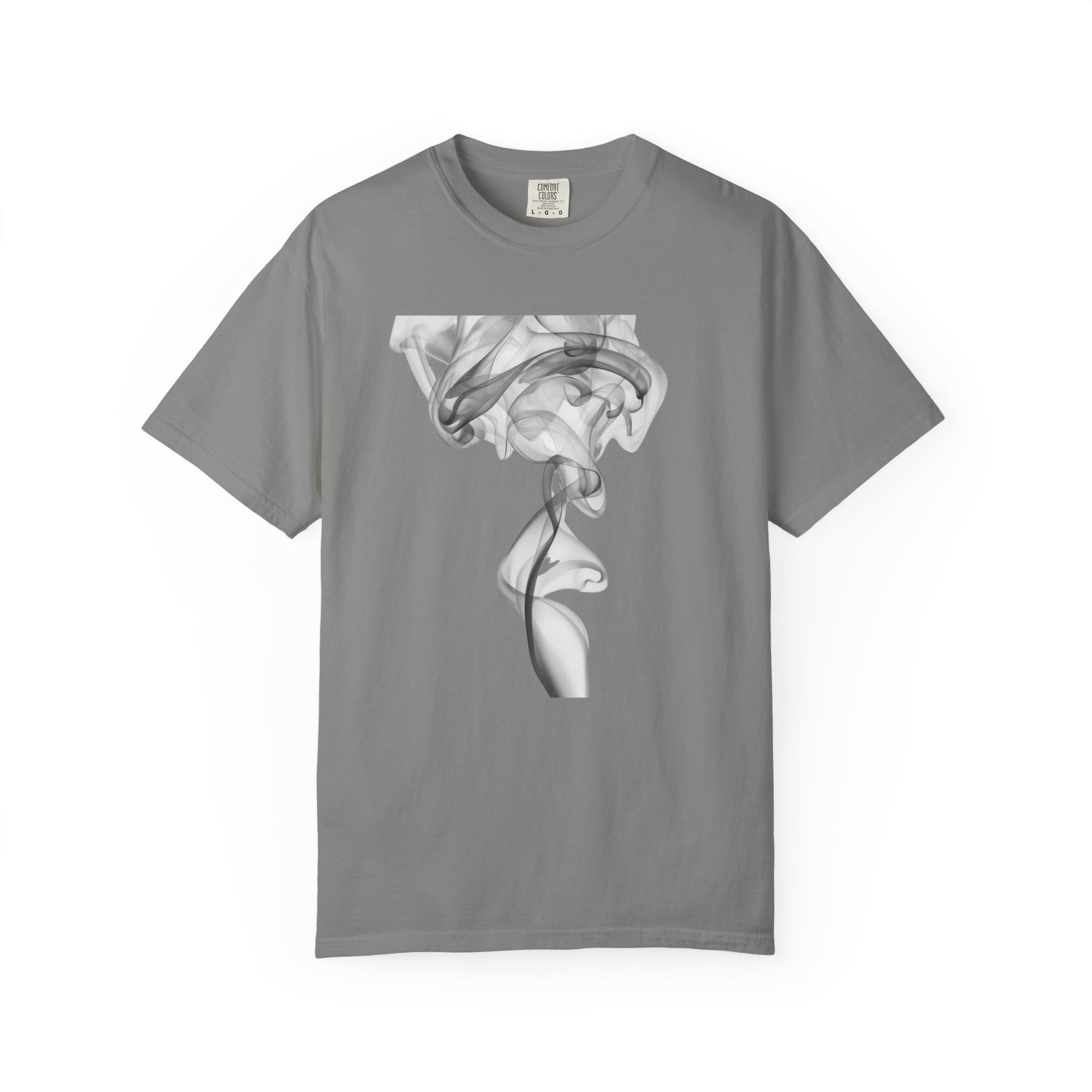 A soft, garment-dyed tee that reads like a quiet moment captured on fabric. The grayscale smoke design drifts down the chest, subtle and meditative—like breath caught between thought and movement. Lightweight but substantial, the relaxed fit and pre-shrunk 100% ring-spun cotton feel lived-in from the first wear. It layers easily under a jacket or stands alone with jeans when you want a low-key, artful look. Made with durable double-needle stitching and a tubular knit for clean lines, this shirt ages gracefully and holds its shape through many washes.