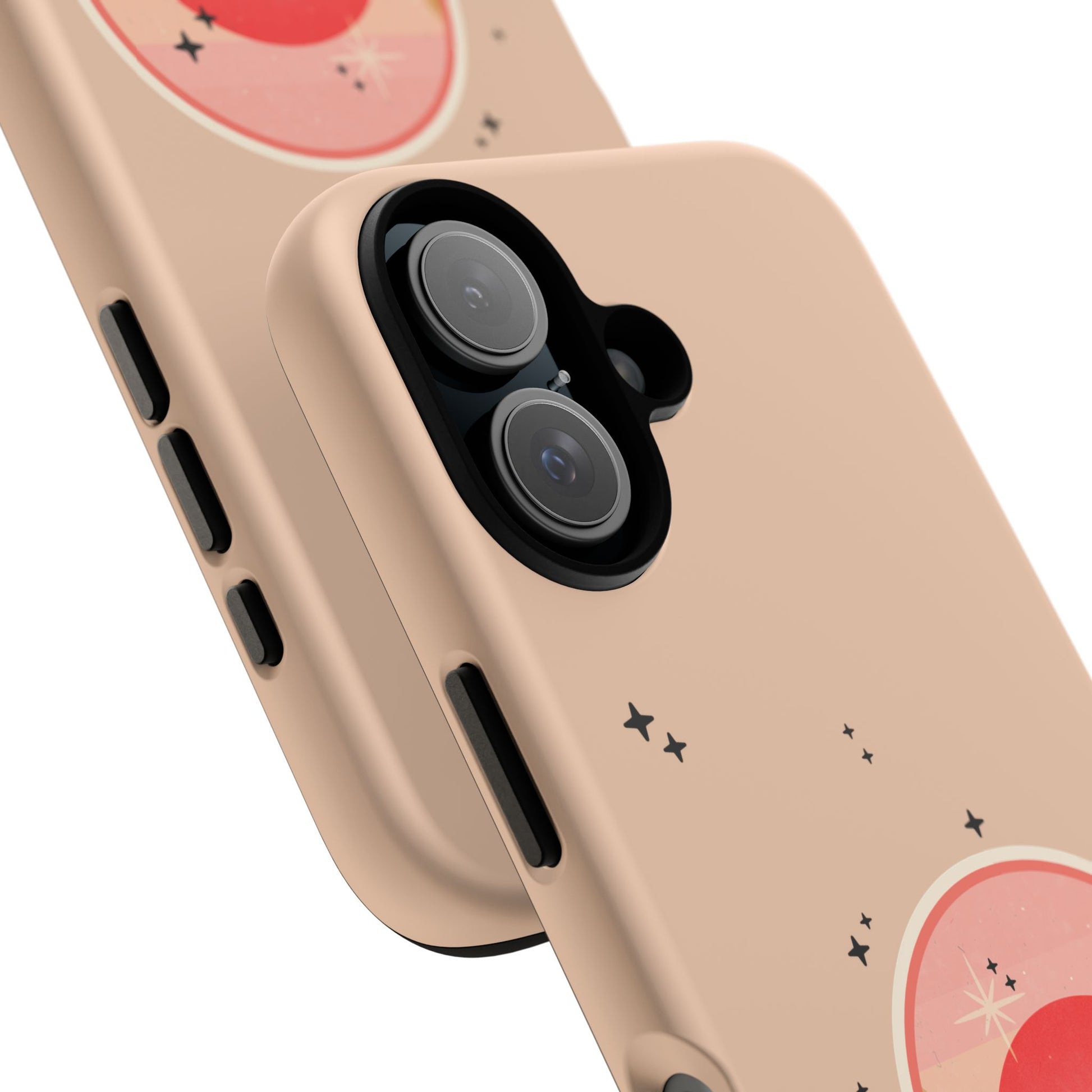 A slim, dual-layer protective phone case that brings a warm, minimal sunset scene to your everyday carry. The soft blush background and circular landscape illustration add a quiet, artistic touch while the reinforced polycarbonate shell and TPU silicone liner stand ready to absorb shocks and impacts. Finished in your choice of glossy or matte, the design is printed with full 3D-wrap ink for rich color across the edges and protected with UV-resistant coating to keep the hues looking fresh outdoors. Thoughtfully engineered with precise cutouts, wireless charging support, and certified material safety, this case balances gentle, low-key style with real-world protection.